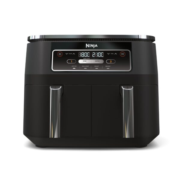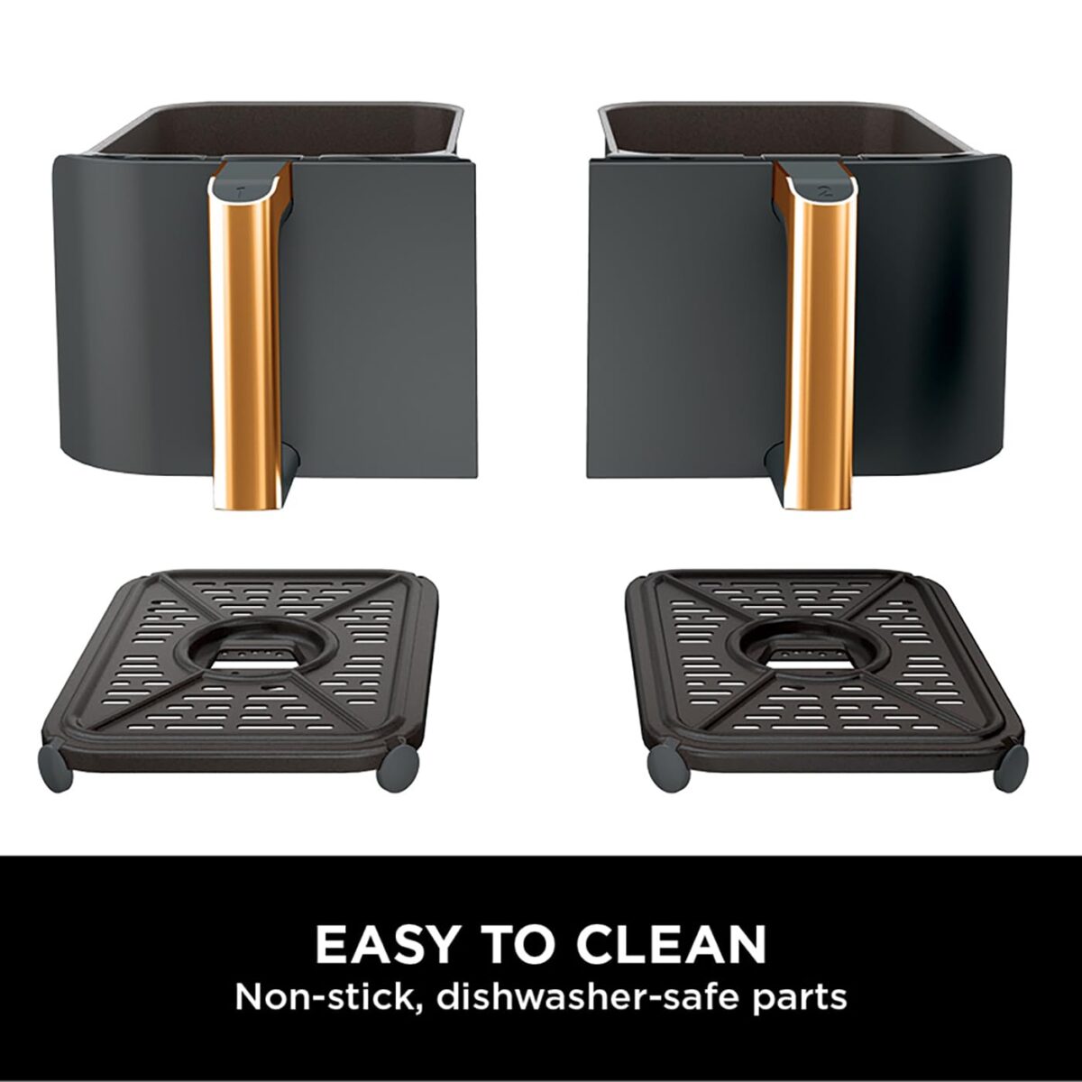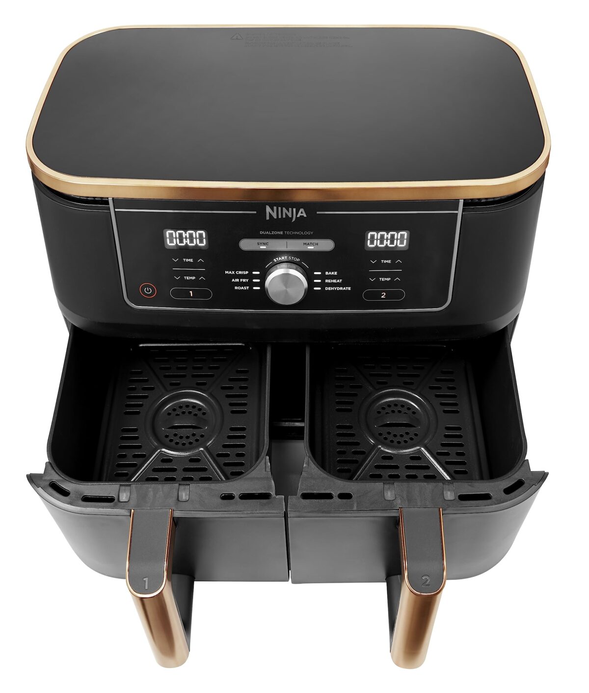 - INCLUDES: Ninja Dual Drawer Air Fryer (UK Plug), Silicone tongs, 2x non-stick dishwasher-safe 4.75L Drawers (9.5L total capacity) & Crisper Plates. Chef-created Recipe Guide. Weight: 8.8kg. Colour: Copper/Black.